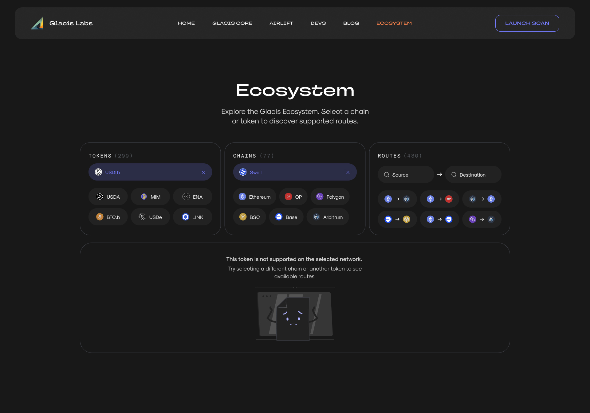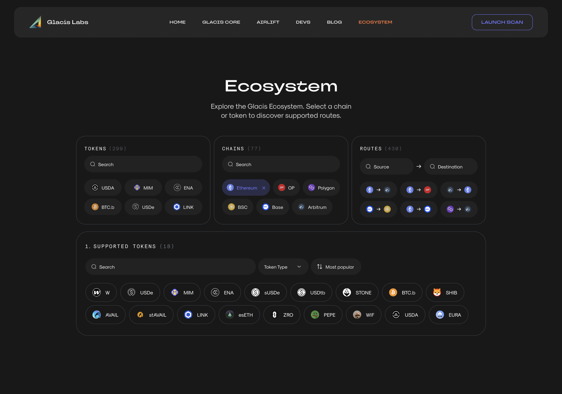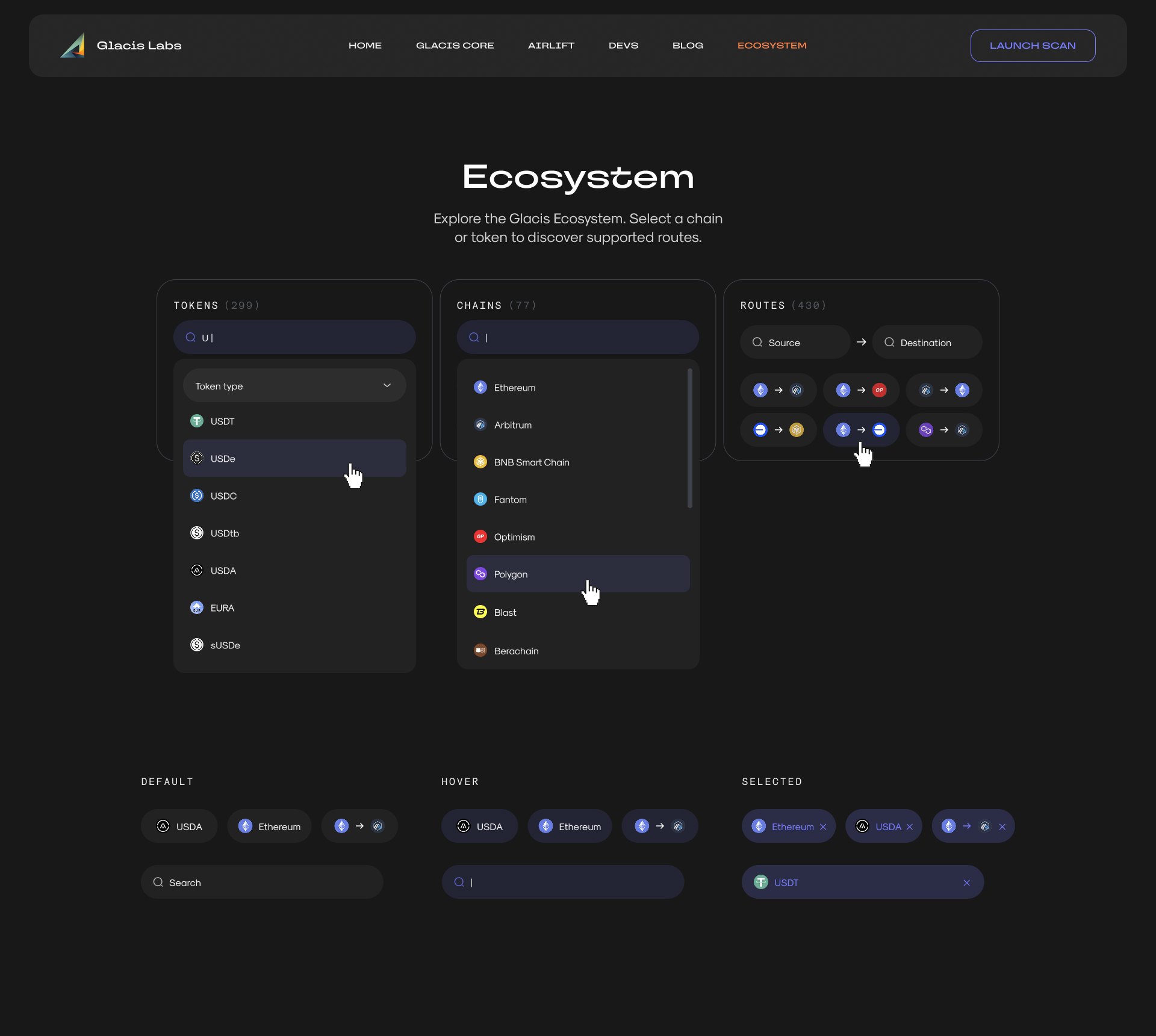 Glacis supports dozens, maybe hundreds, of tokens, chains, and routes. The task was to give users a tool to check a specific combination. I designed a widget with cascading filtering: three columns, Tokens / Chains / Routes, working independently but in sync. You can pick just a token and instantly see all supported chains and routes for it. Pick only a chain and get the supported tokens and route options. Token + chain shows every possible route between them. You can also search directly by route, Source -> Destination. Every combination produces its own result, all inside one component and in just a couple of clicks.