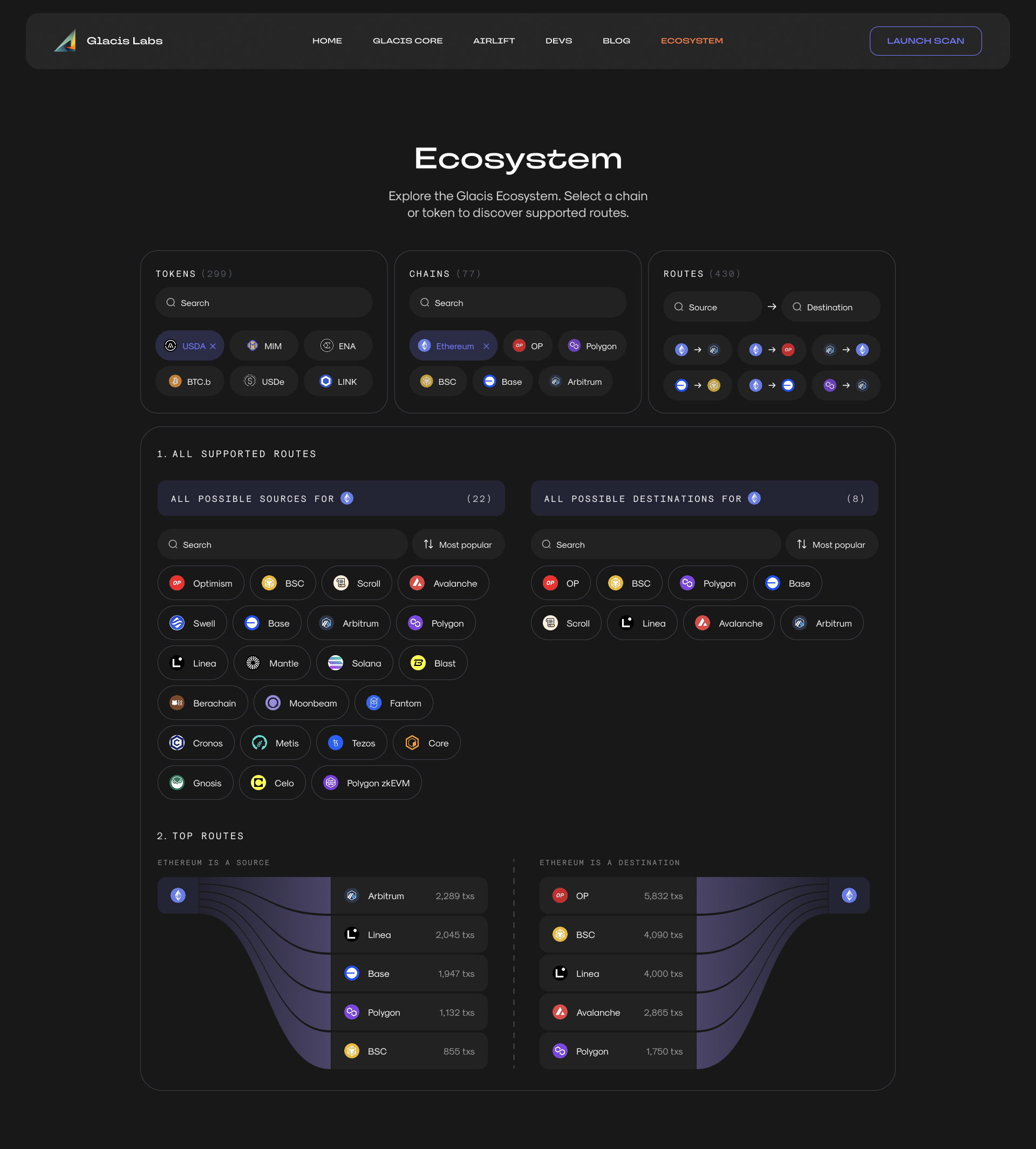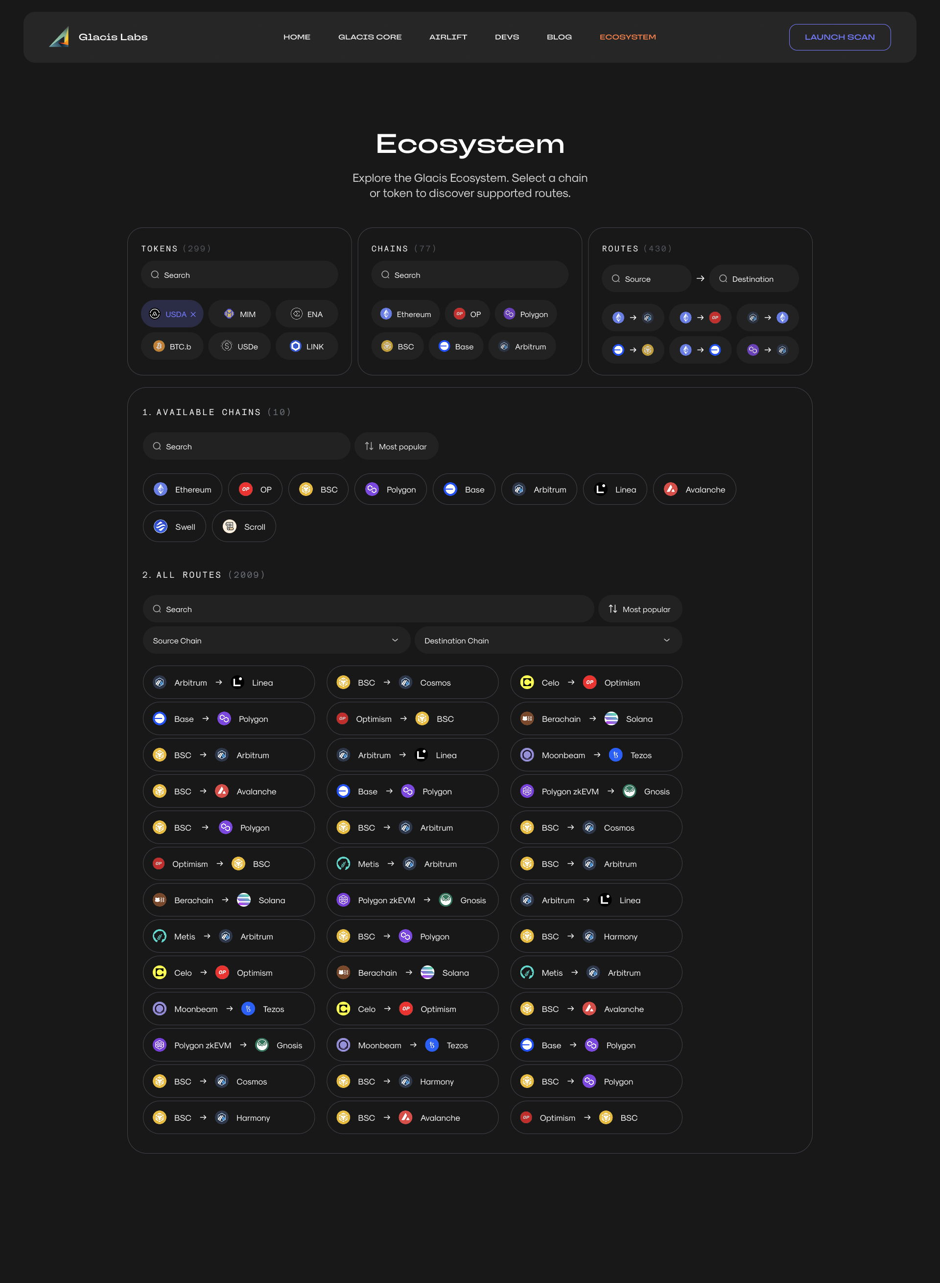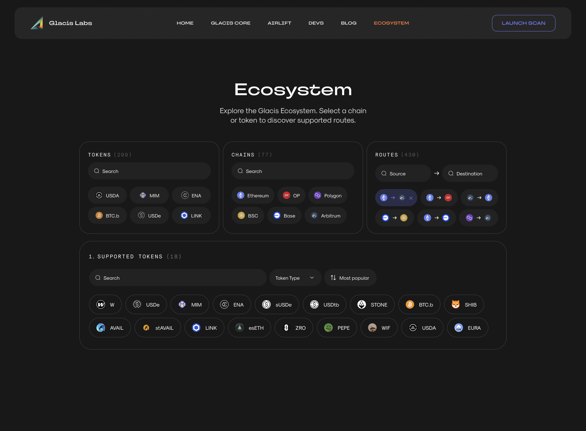 Glacis supports dozens, maybe hundreds, of tokens, chains, and routes. The task was to give users a tool to check a specific combination. I designed a widget with cascading filtering: three columns, Tokens / Chains / Routes, working independently but in sync. You can pick just a token and instantly see all supported chains and routes for it. Pick only a chain and get the supported tokens and route options. Token + chain shows every possible route between them. You can also search directly by route, Source -> Destination. Every combination produces its own result, all inside one component and in just a couple of clicks.