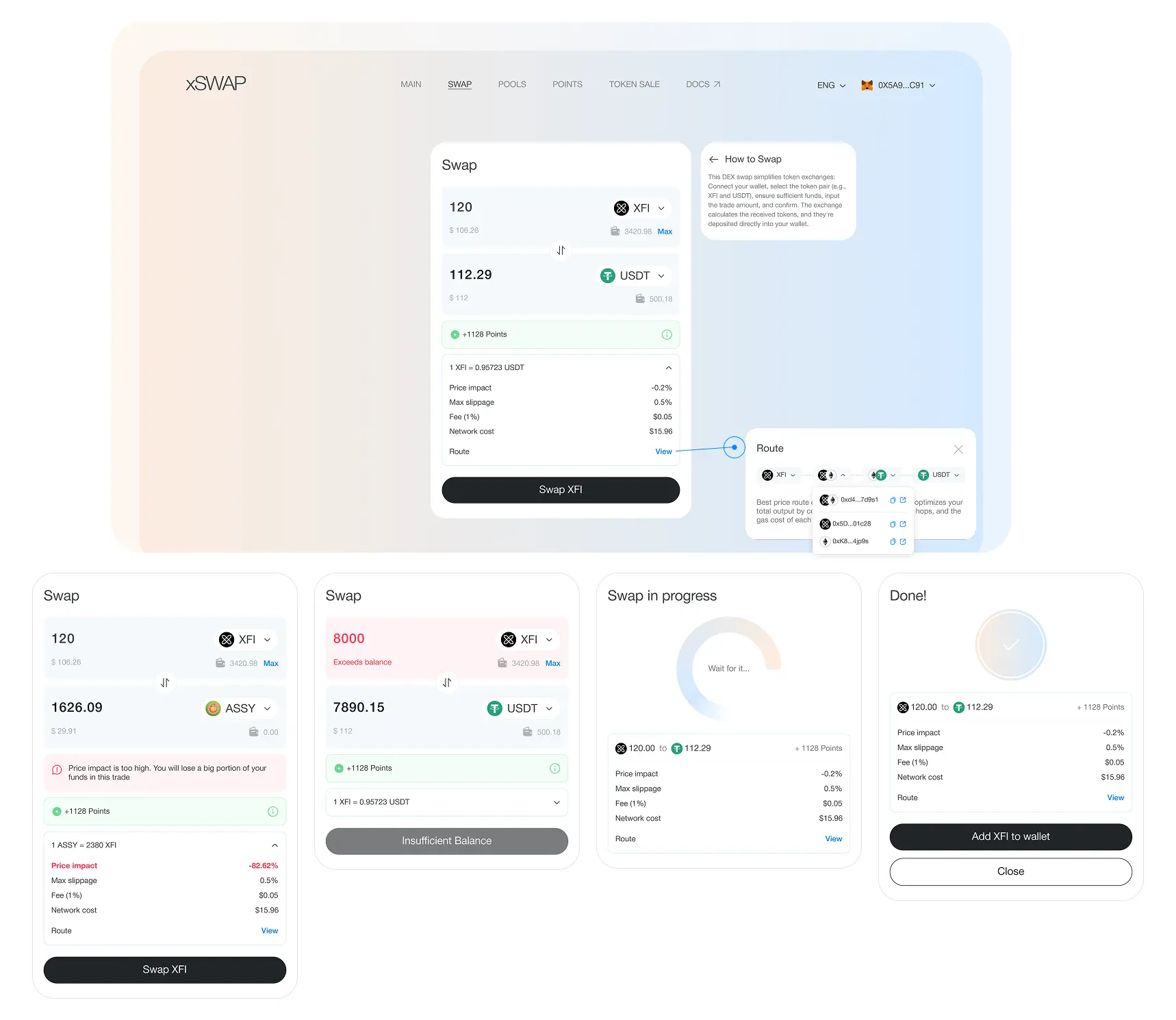 xSwap is an AMM on the CrossFi network. It includes swap, liquidity pools, staking, token sale, and a veToken voting mechanism that controls how incentives are distributed. My goal was to design a product UX/UI where beginners don’t get stuck on “how do I even swap on a new network?”, while advanced users can open the Route view and see (and trust) how well the system optimizes it.